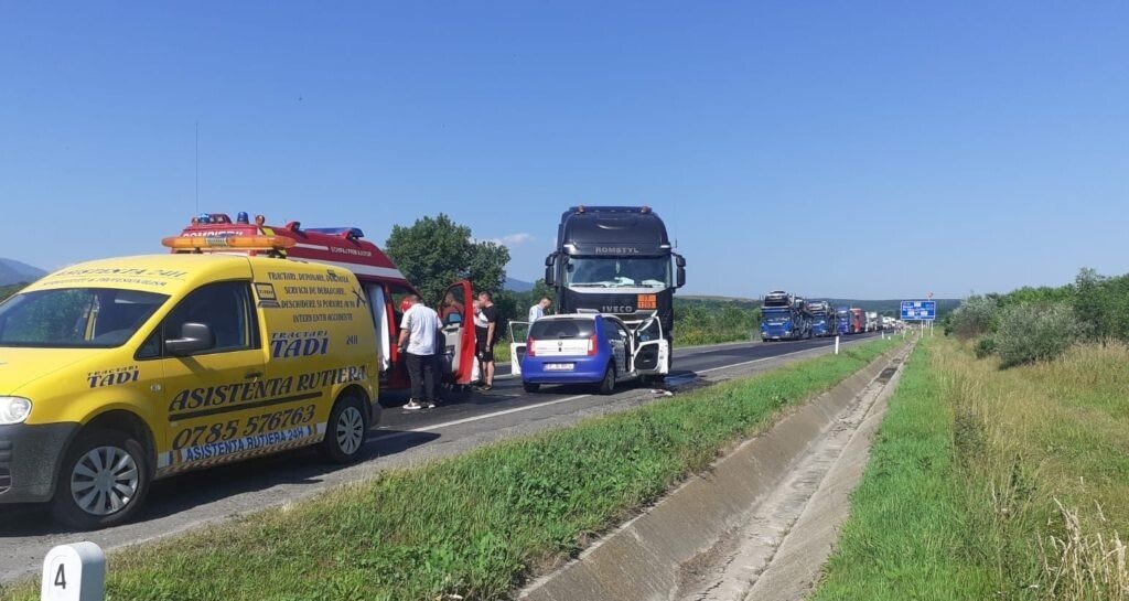 O autocisternă și un autoturism au intrat în coliziune pe DN 1, km 295+200, după sensul giratoriu PC Veștem spre Hula Bradului.