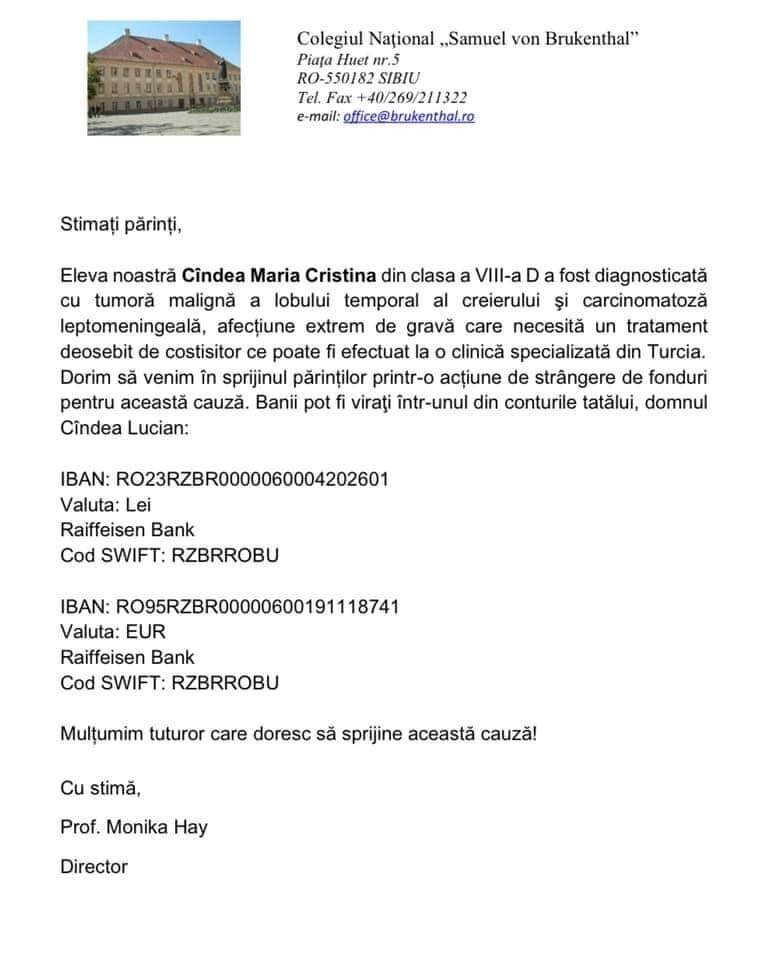 Cîndea Maria Cristina absolventă a clasei a VIII-a, a primit o veste cumplită în urma analizelor efectuate. Tânăra a fost diagnosticată cu o tumoră malignă a lobului temporal al creierului și carcinomatoză leptopemingeală, afecțiune extrem de gravă care necesită un tratament deosebit de costisitor.