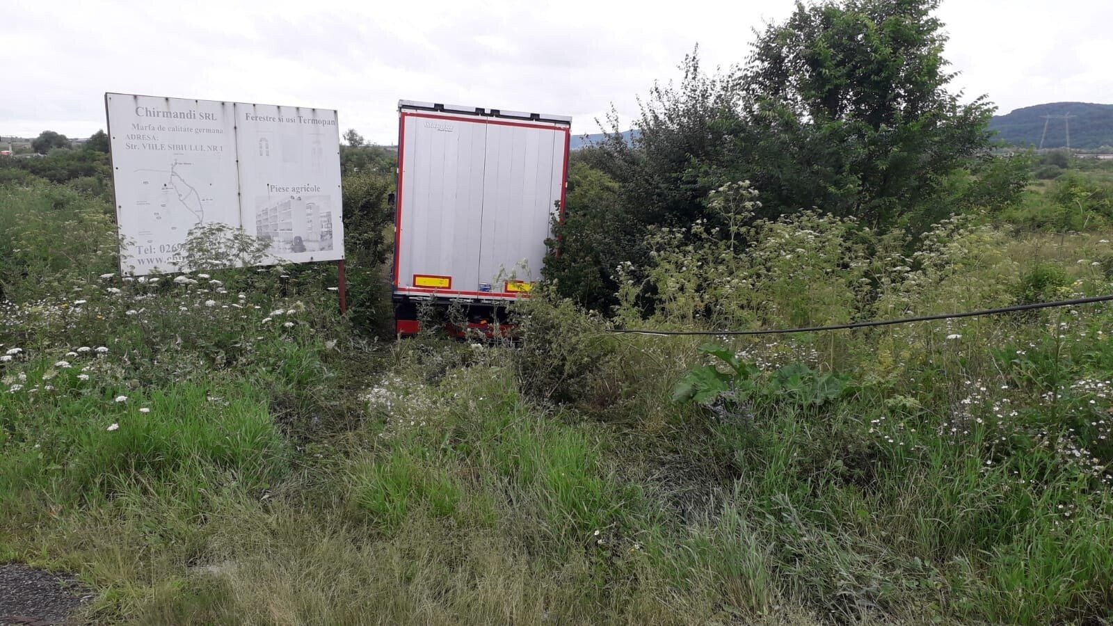Un șofer care conducea un autocamion în apropierea sensului giratoriu de la Caucho Șelimbăr a pierdut controlul volanului și a ieșit în afara părții carosabile.