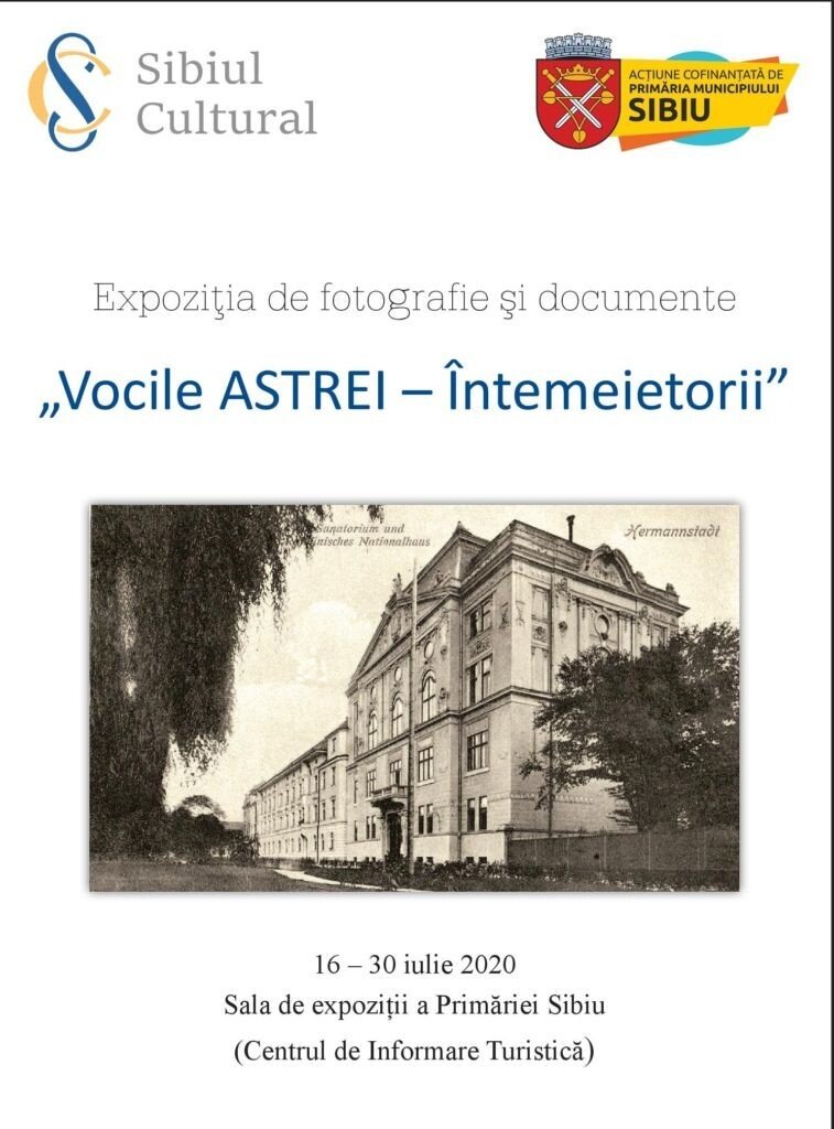 Expoziția de fotografie și documente „Vocile ASTREI – Întemeietorii” este deschisă, în perioada 16-30 iulie 2020, sibienilor și turiștilor, în Sala Expozițională a Primăriei Sibiu (Centrul de Informații pentru Turiști, cu acces din Piața Mare), în cadrul proiectului „Asociațiunea ASTRA – recuperarea unei Memorii culturale”, desfășurat de Asociația Sibiul Cultural și cofinanțat de Primăria Sibiu, prin Agenda Culturală 2020.