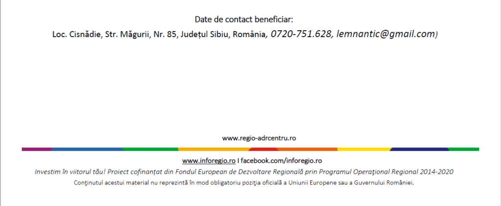 Programul Operațional Regional 2014-2020 este implementat la nivel național de către Ministerul Lucrărilor Publice, Dezvoltării și Administrație în calitate de Autoritate de Management, iar la nivel regional de către ADR Centru, organism intermediar al programului ce monitorizează implementarea acestui proiect în Regiunea Centru. Proiectul este prevăzut a se derula în perioada 25.06.2020 – 30.06.2021.