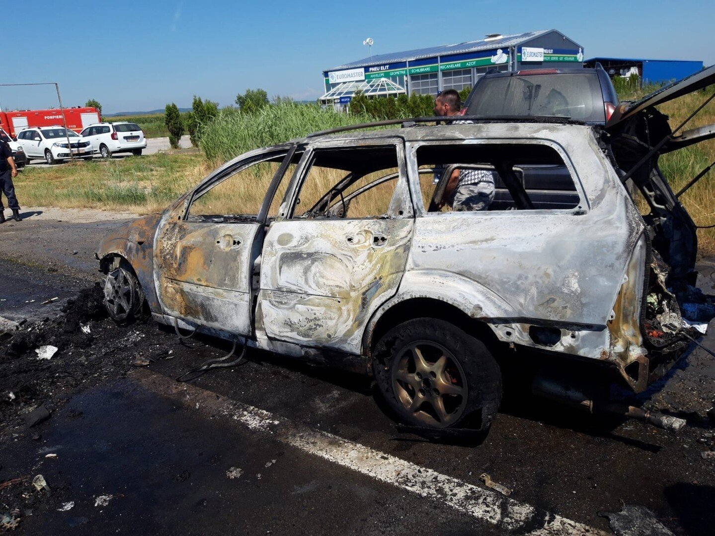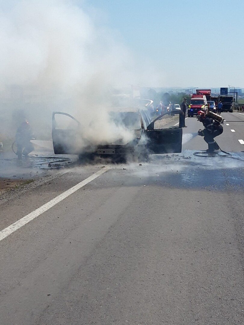 ISU Sibiu intervine cu o autospecială de stingere cu apă și spumă, pe DN 1, la intrare în localitatea Cristian dinspre Sibiu, pentru localizarea și lichidarea unui incendiu izbucnit la un autoturism.