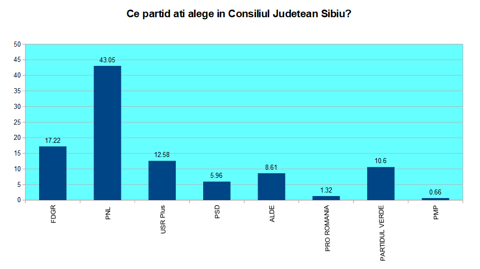 Cât priveşte intenţia de vot a sibienilor pentru Consiliul Judeţean sondajul aduce şi aici mari suprize. PNL ar obţine 43,05% din voturi. Dacă socotim şi voturile potenţiale din judeţ sunt şanse mari ca PNL să reuşească o premieră: majoritate în Consiliul Judeţean. FDGR are 17,22% intenţie de vot. Ştiind că în judeţ obţin puţine voturi de obicei, din lipsă de organizaţii, rezultă un procent final de aproximativ 10%, ceea ce este mult sub actualul număr de locuri. USR-Plus este cotat de sibieni cu 12,58%, iar Partidul Verde cu 10,6%. ALDE depăşeşte PSD, fiind cotat cu 8,61% versus 5,96%. Votul final în cazul ultimelor partide este influenţat de intenţia de vot din restul judeţului, dar schimbările nu pot fi majore. Tendinţa în scădere a PSD văzută la alegerile europarlamentare şi prezidenţiale continuă, se pare. Revigorarea ALDE după apariţia noilor candidaţi este semnificativă.