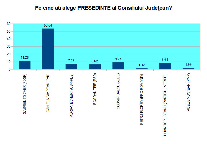 Daniela Cîmpean este urmată de Gabriel Tischer (FDGR) cu 11,26% intenţie de vot, Cosmin Balcu (ALDE) 9,27% şi Iulian Topliceanu (Partidul Verde) cu 8,61%. Supriza Partidului Verde de la Consiliul Local o regăsim şi la Consiliul Judeţean. Se remarcă totuşi creşterea adusă de Cosmin Balcu pentru ALDE în intenţia de vot, ţinând cont că acesta abia şi-a anunţat candidatura. USR-Plus şi PSD obţin scoruri foarte slabe. Sondajul a arătat că adesea votanţii USR-Plus la Consiliul Local şi Judeţean, nu aleg candidaţii partidului pentru Primar şi Preşedinte CJ, ci pe cei ai PNL sau FDGR.