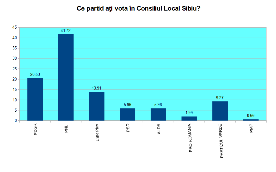La ora actuală FDGR deţine majoritatea simplă în Consiliul Local Sibiu, restul locurilor fiind împărţite între PSD şi PNL. Din intenţia de vot, chestionată de SIBIU INDEPENDENT stradal, se configurează un nou Consiliu Local dominat de PNL cu 41,72%. FDGR pierde pentru prima oară din 2004 majoritatea şi scoate un scor de 20,53%. Un scor cu 10 procente sub cel al primarului FDGR, Astrid Fodor. USR-Plus este cotat cu 13,91%, adică peste candidatul său la Primărie. Iar Partidul Verde scoate 9,27% fiind din nou o surpriză.