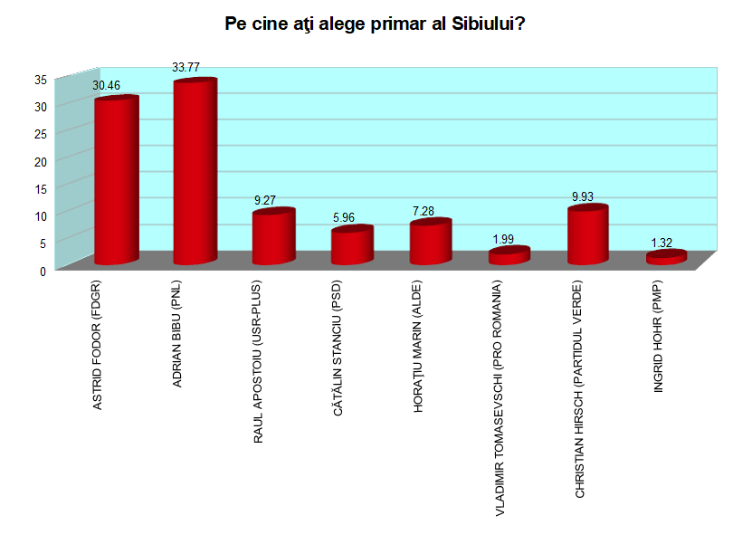 Pentru prima dată din anul 2000, când Iohannis învingea în turul 2, candidatul PSD, Ioan Cindrea şi câştiga Primăria Sibiu, avem o luptă strânsă pentru postul de primar la Sibiu. Astrid Fodor, primarul FDGR în funcţie este cotată cu 30,46% intenţie la vot, fiind puţin depăşită de candidatul PNL, Adrian Bibu cotat cu 33,77%. Disputa între PNL şi FDGR este o premieră în istoria politică locală, cele două partide colaborând până acum. Se pare că şi vizita de sâmbătă seara a preşedintelui Iohannis a avut rolul de a transmite un semnal în rândul populaţiei pentru viitorul oraşului.