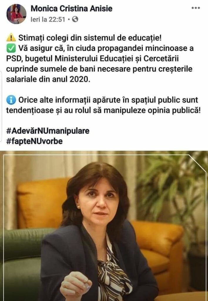 Ministrul Educaţiei, Monica Anisie a scris aseară pe Facebook imediat că articolele din presă sunt miniciuni şi că salariile vor creşte în anul 2020 pentru profesori. Dar astăzi la prânz postarea Ministrului a dispărut de pe pagina ei, totuşi am reuşit o captură a acesteia.