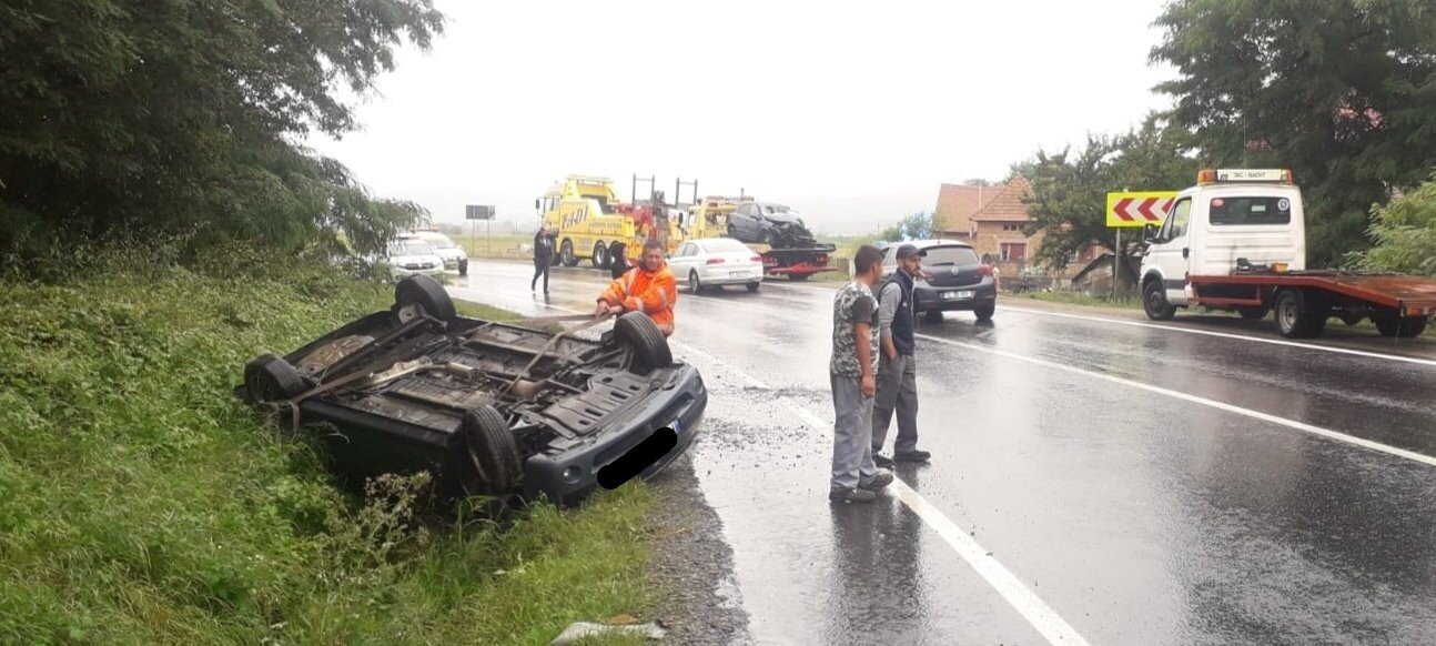 Un șofer care circula cu viteză neadaptată condițiilor meteo a pierdut controlul volanului și s-a răsturnat la intrare în Porumbacu de Jos.