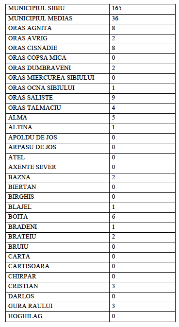 Vă informăm că la data de astăzi, 19 august a.c. în județul Sibiu sunt active un număr de 302 de cazuri confirmate pozitiv în urma testării SARS CoV-2, distribuite conform tabelului de mai jos pe raza Unităților Administrativ Teritoriale ale județului Sibiu” a declarat Andreea Ștefan, purtătorul de cuvânt al Prefecturii Sibiu