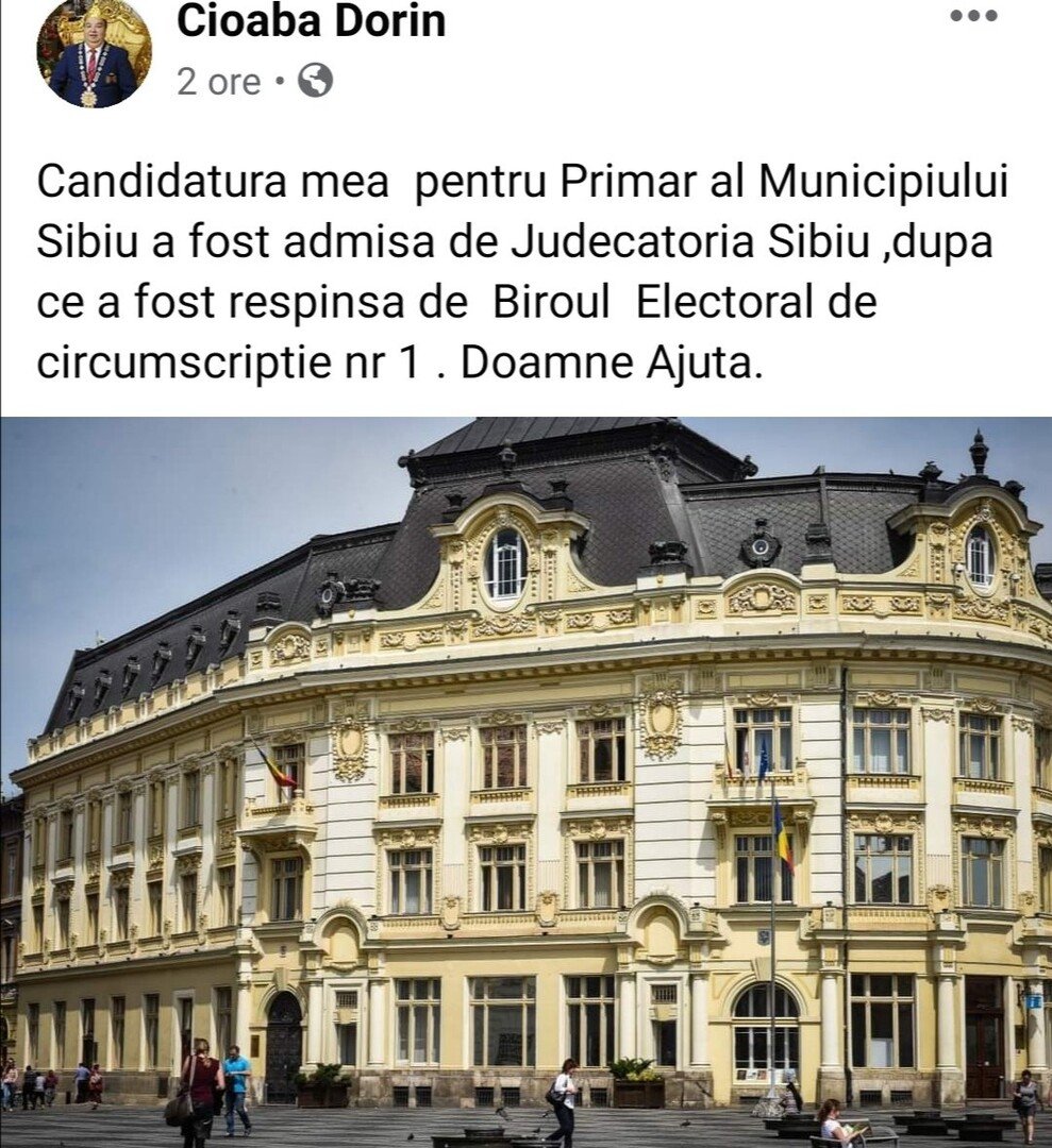 Dorin Cioabă, intitulat Regele Romilor, şi-a depus candidatura la funcţia de primar al Municipiului Sibiu. Biroul Electoral de Circumscripţie nr. 1 i-a respins candidatura, dar Cioabă a apelat la Judecătoria Sibiu care i-a admis candidatura. Dorin Cioabă va candida din partea Partidei Romilor.