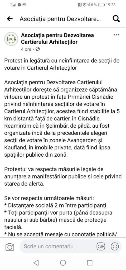 „Asociația pentru Dezvoltarea Cartierului Arhitecților dorește să organizeze săptămâna viitoare un protest în fața Primăriei Cisnădie privind neînființarea secțiilor de votare în Cartierul Arhitecților, acestea fiind stabilite la 5 km distanță față de cartier, în Cisnădie. (…) Protestul va respecta măsurile legale de anunțare a manifestărilor publice și cele privind starea de alertă.” se anunţa astăzi pe pagina de Facebook a asociaţiei. Jandarmeria Română a publicat pe siteul lor şi pe Facebook la alte proteste de acest gen în această perioadă interdicţia: „Pe timpul stării de alertă, organizarea și desfășurarea de mitinguri, demonstrații sau orice alte întruniri sunt interzise. Pentru sănătatea dumneavoastră și protecția celorlalți cetățeni, vă recomandăm să nu participați la astfel de evenimente.”