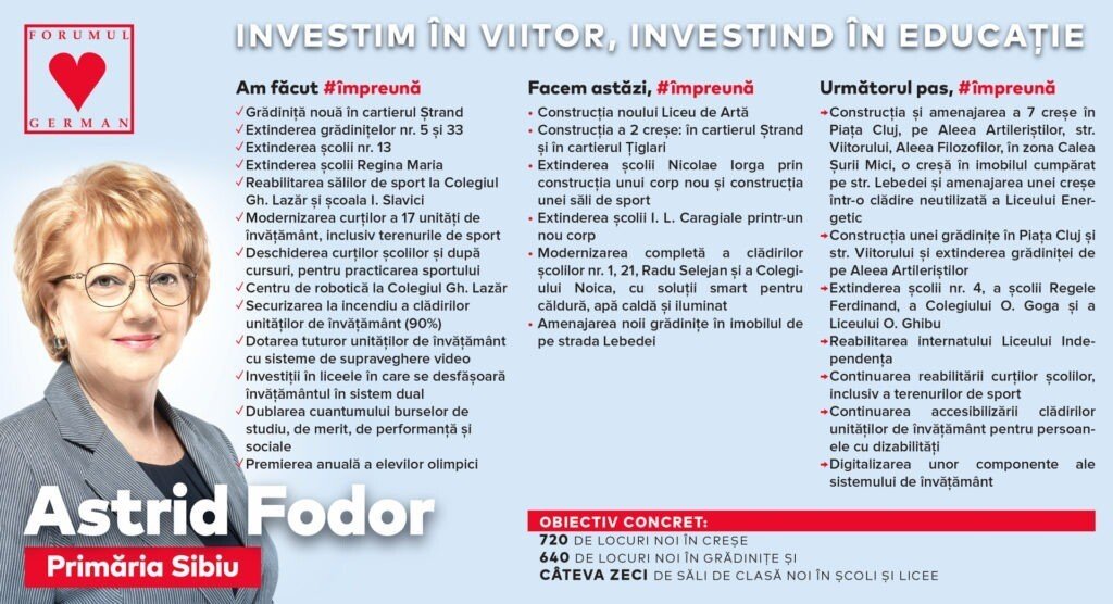 Astrid Fodor: Pentru mine și colegii din Forum educația a fost mereu un domeniu prioritar de acțiune, de aici și sumele importante alocate pentru sectorul învățământului. În acești ultimi ani am realizat investiții în clădirile creșelor, grădinițelor, școlilor și liceelor în valoare de 60 de milioane de lei, lucrări care sunt efectiv realizate și plătite. La acestea se adaugă alte proiecte în curs în valoare de aproape 42 de milioane lei. Pentru alte 6 proiecte Primăria a demarat procedurile de achiziție și urmează să semnăm contractele pentru execuția lucrărilor, investițiile însumând alte 59 de milioane de lei. Prin urmare, în 5 ani valoarea investițiilor și proiectelor inițiate s-a ridicat la peste 33 de milioane de euro. Promisiunea electorală de acum patru ani s-a transformat în proiecte concrete în decursul acestui mandat.