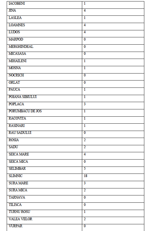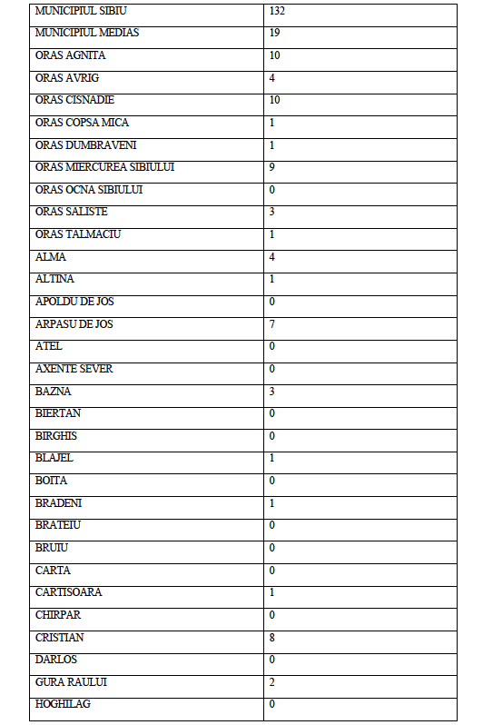 La data de astăzi, 6 septembrie a.c. în județul Sibiu sunt active un număr de 281 de cazuri confirmate pozitiv în urma testării SARS CoV-2, distribuite conform tabelului de mai jos pe raza Unităților Administrativ Teritoriale ale județului Sibiu.