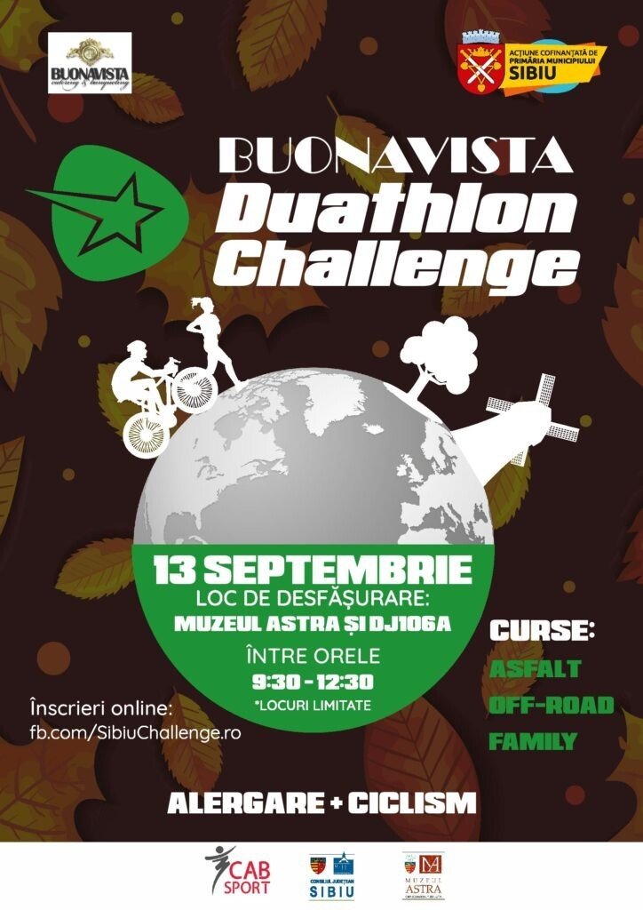 Buonavista Duathlon Challenge, cel mai inedit concurs din Sibiu, care îmbină alergarea cu mersul pe bicicletă, va avea loc duminică, 13 septembrie în aceeaşi locaţie de poveste cu care ne-am obişnuit: Muzeul în aer liber din Dumbrava Sibiului + DJ 106 A Sibiu – Rășinari. Peste 200 de concurenți din Sibiu şi județele învecinate sunt aşteptaţi să ia startul ineditului concurs, începând cu ora 10.00.