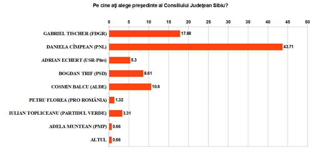 Între cele două sondaje PNL a pierdut 10%, iar Astrid Fodor (FDGR) a câştigat aproape 15%. Ea este încă mult peste partid, situaţie în care se găseşte şi preşedinta Consiliului Judeţean, Daniela Câmpean (PNL). Aproape jumătate din sibieni sunt mulţumiţi cu această conducere FDGR la Primăria Sibiu şi PNL la Consiliul Judeţean Sibiu. Situaţia se complică la Consiliul Local Sibiu şi cel Judeţean unde opţiunile sunt mai variate şi vor include mai multe partide decât situaţia de la ora actuală.