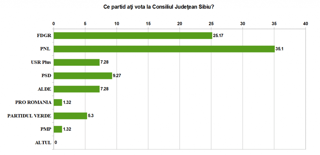 Situaţia stă la fel la intenţia de vot pentru Consiliul Judeţean Sibiu, unde FDGR a câştigat procente şi PNL le-a pierdut. PNL rămâne în municipiul Sibiu cu o intenţie de vot pentru CJ de 35,1%, iar FDGR urcă la 25,17%. Şi la judeţ USR-Plus şi Verzii sunt în scădere şi PSD în urcare.