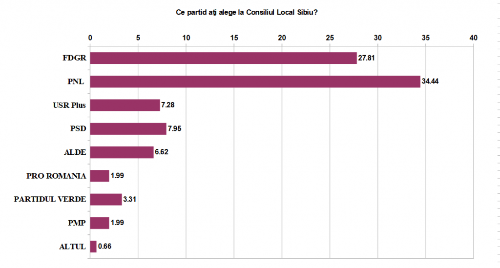 PNL a scăzut şi la intenţia de vot pentru Consiliul Local Sibiu, dar mai puţin, doar 7,28%. FDGR însă a câştigat 7% în plus în această perioadă. Căderi semnificative au înregistrat şi USR-Plus şi Partidul Verde. Pe creştere sunt PSD, ALDE şi PMP. Acum diferenţa dintre PNL, primul clasat şi FDGR s-a micşorat la doar 6%.