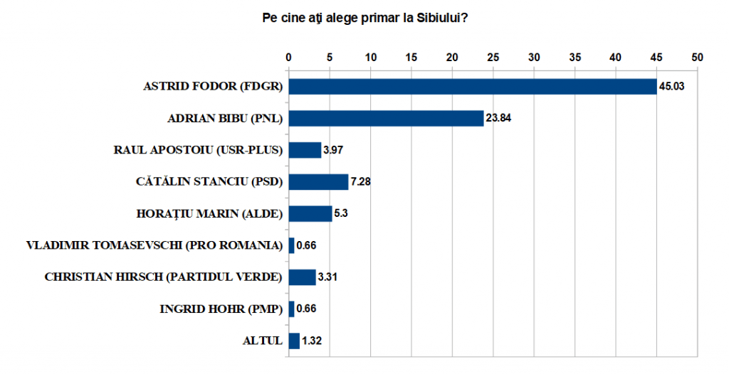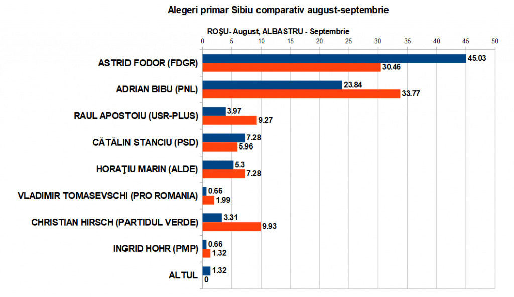 Comparativ cu rezultatele înregistrate la începutul lunii august, la funcţia de primar al municipiului Sibiu s-a produs o răsturnare între primele două poziţii. Adrian Bibu (PNL) cotat în august cu 33,77% a scăzut cu aproape 10% şi a trecut pe locul 2. Astrid Fodor (FDGR), primarul în funcţie, a crescut brusc de la 30,46% la 45,03% şi a preluat şefia clasamentului cu aproape dublu scor faţă de Bibu. Fodor a preluat şi din voturile candidatului Partidului Verde, Christian Hirsch, care era surpriza lunii august cu 9,93%, dar s-a prăbuşit la 3,31%. Raul Apostoiu de la USR-Plus a căzut şi el în sondaj de la 9,27% la 3,97%. Pe creştere, dar mică, este doar Cătălin Stanciu de la PSD, de la 5,96% la 7,28%.