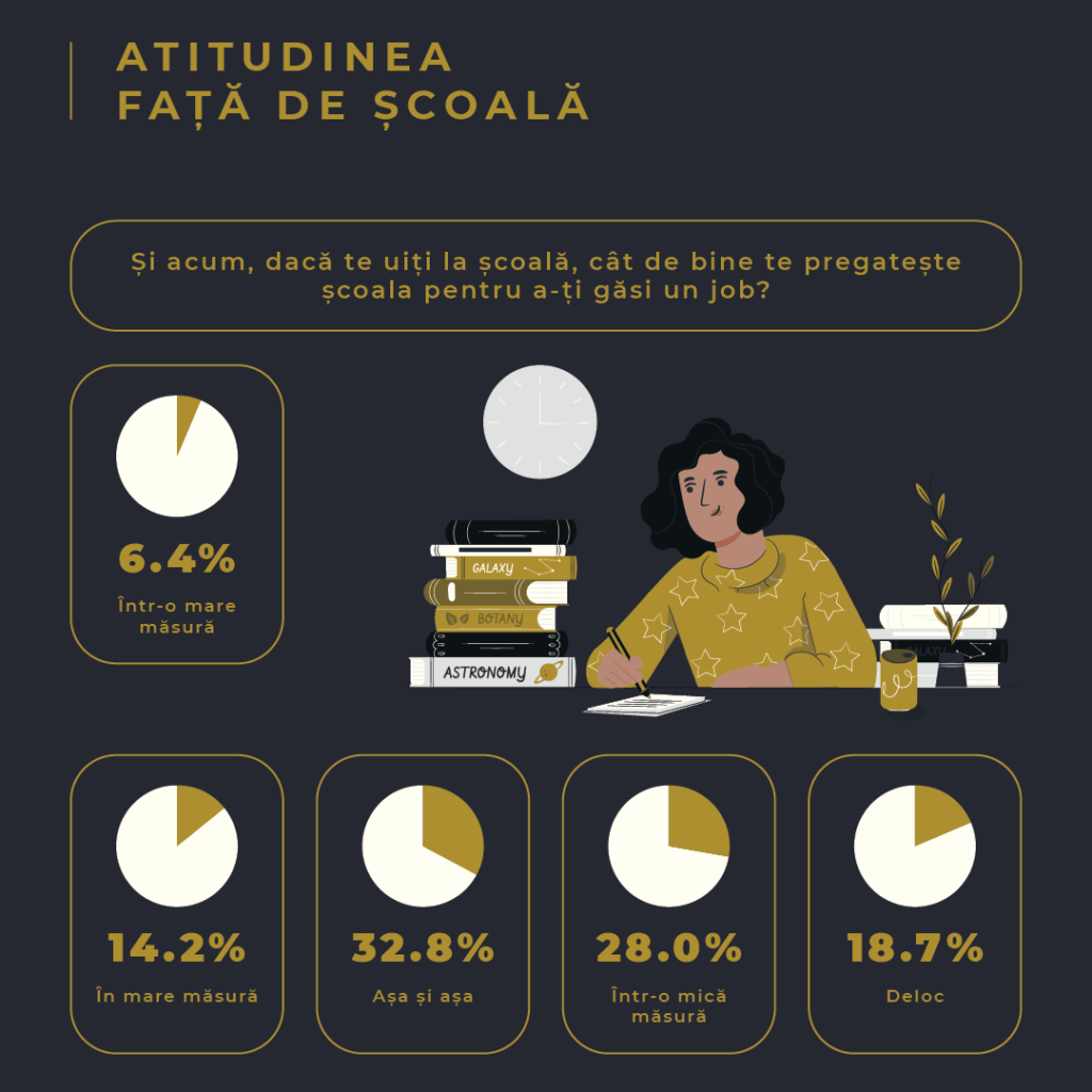 Doar unu din cinci tineri români cu vârsta între 16 și 14 de ani consideră că școala îl pregătește pentru un job, în timp ce aproximativ unu din doi tineri consideră că îi pregătește într-o mică măsură sau deloc.