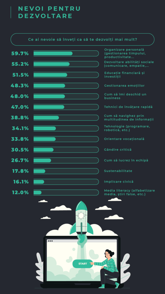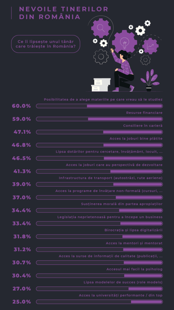 Întrebați despre lipsurile tinerilor din România, 60% dintre respondenți au spus că și-ar dori să aibă posibilitatea de a-și alege materiile pe care să le studieze. 59% dintre tineri au menționat resursele financiare în timp ce 47% au nevoie de consiliere în carieră, același procent al tinerilor care își doresc acces la joburi bine plătite.