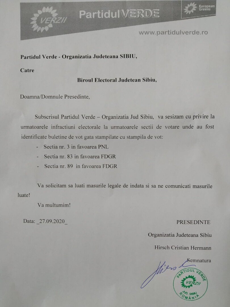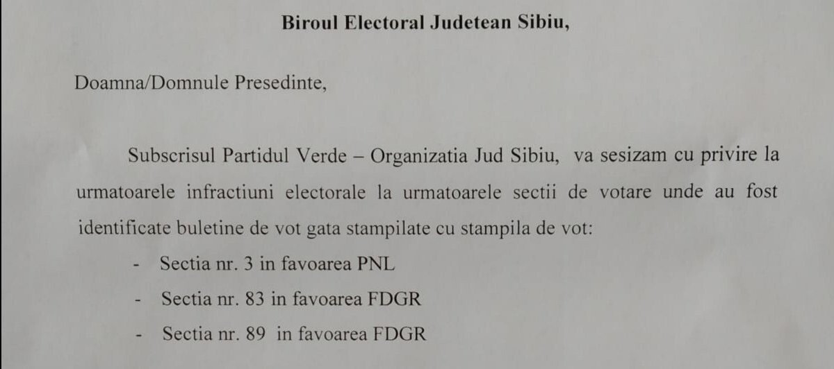 ACTUALIZARE: Biroul Electoral al Circumscripției a răspuns sesizării Partidului Verde și urmează ca membrii secțiilor de votare să verifice fiecare buletin de vot în parte care urmează să fie înmânat alegătorului dar și anunțarea imediată a organelor competente în cazul unei fraude.