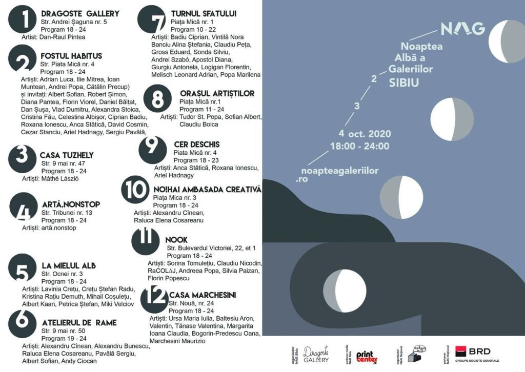 Locaţiile galeriilor ce pot fi vizitate gratuit 3 nopţi la rând în acest week-end în orarul 18-24 este disponibil pe pagina de Facebook a evenimentului Noaptea Albă a Galeriilor Sibiu. Cei interesaţi pot găsi locaţiile şi pe aplicaţia de telefon Sibiu City App.