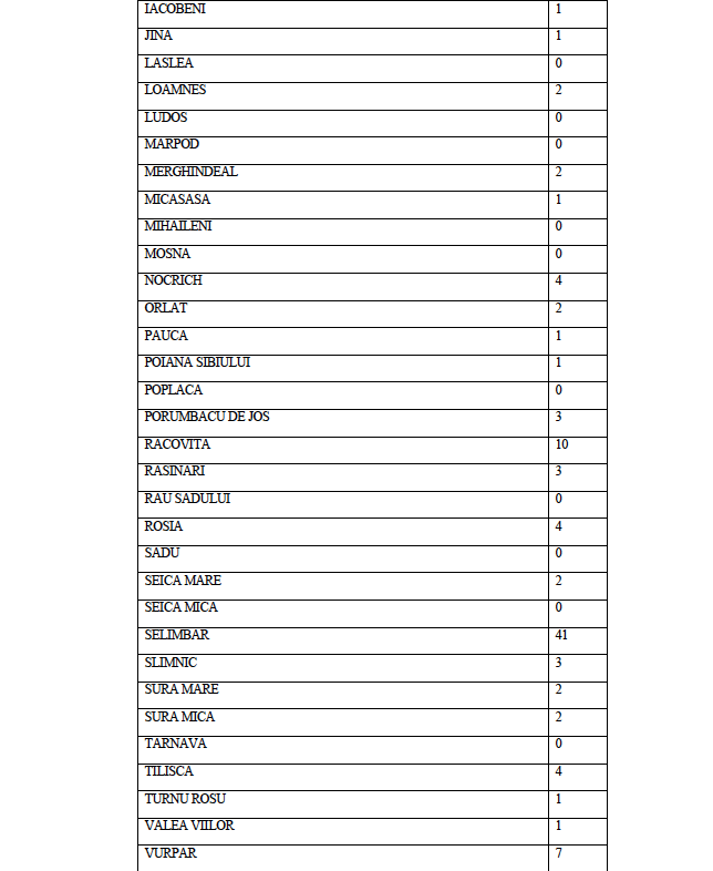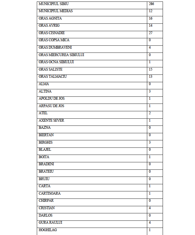 La data de astăzi, 11 octombrie 2020, în județul Sibiu sunt active un număr de 509 de cazuri confirmate pozitiv în urma testării SARS CoV-2, distribuite conform tabelului de mai jos pe raza Unităților Administrativ Teritoriale ale județului Sibiu.