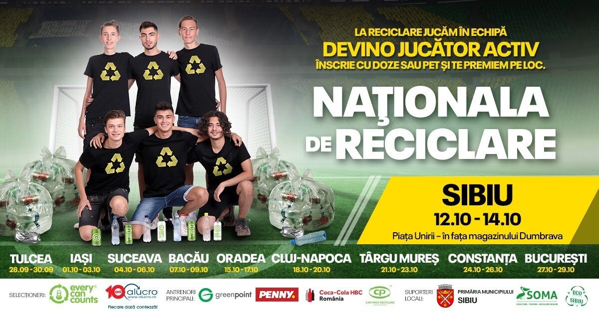 Asociaţia Alucro şi Every Can Counts România, în parteneriat cu GreenPoint Management, PENNY, Coca-Cola HBC, Bergenbier S.A. şi Can Pack Recycling invită locuitorii oraşului Sibiu să intre în echipă pentru reciclarea dozelor din aluminiu sau a sticlelor PET pe care le au acasă, în schimbul unor premii care pot fi folosite în beneficiul întregii familii. Acţiunea face parte din campania Naţionala de Reciclare, derulată în 10 oraşe din România până la sfârşitul lunii octombrie 2020.
