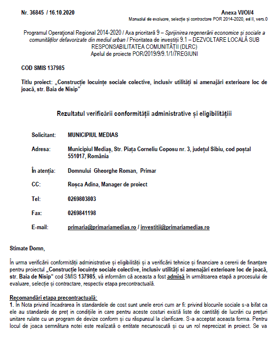 Agenţia pentru Dezvoltare Regională Centru a trimis astăzi Primăriei Mediaş o notificare, prin care se aprobă intrarea în faza pre-contractuală, din fonduri europene, a construcţiei a 80 de locuinţe sociale pe strada Baia de Nisip. Valoarea totală a proiectului este de 18,9 milioane lei.