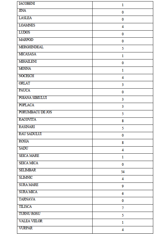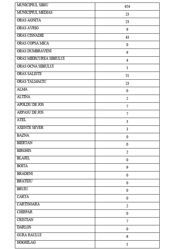 La data de astăzi, 18 octombrie a.c. în județul Sibiu sunt active un număr de 835 de cazuri confirmate pozitiv în urma testării SARS CoV-2, distribuite conform tabelului de mai jos pe raza Unităților Administrativ Teritoriale ale județului Sibiu.