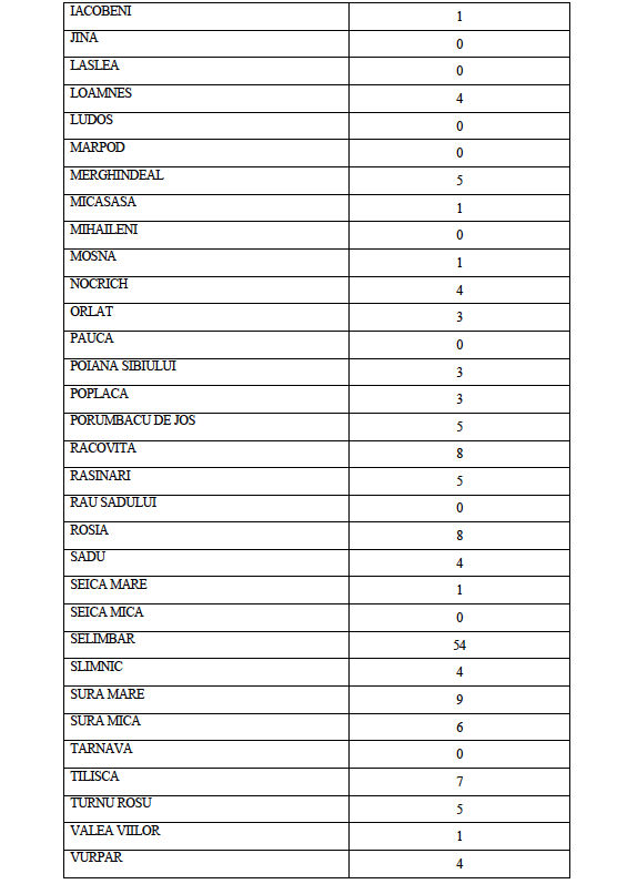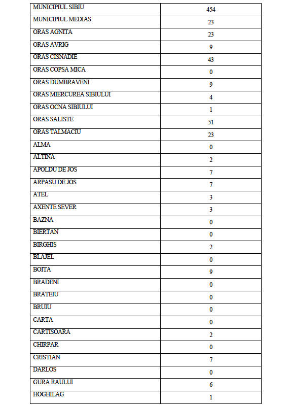 Astăzi, 18 octombrie a.c. în județul Sibiu sunt active un număr de 835 de cazuri confirmate pozitiv în urma testării SARS CoV-2, distribuite conform tabelului de mai jos pe raza Unităților Administrativ Teritoriale ale județului Sibiu.