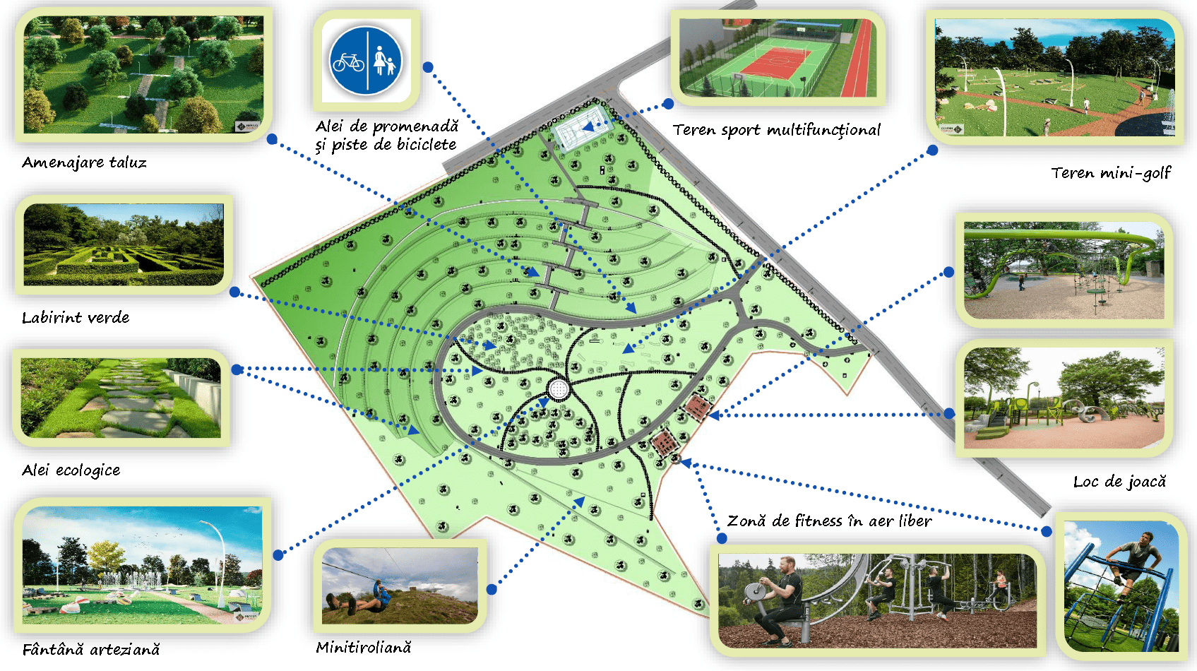 Amenajarea sistemului de iluminat public în parc, cu corpuri eco-eficiente cu LED. O parte din stâlpii de iluminat vor fi dotați cu camere video, prize de încărcare a dispozitivelor mobile și hotspot-uri WI FI pentru internet gratuit.