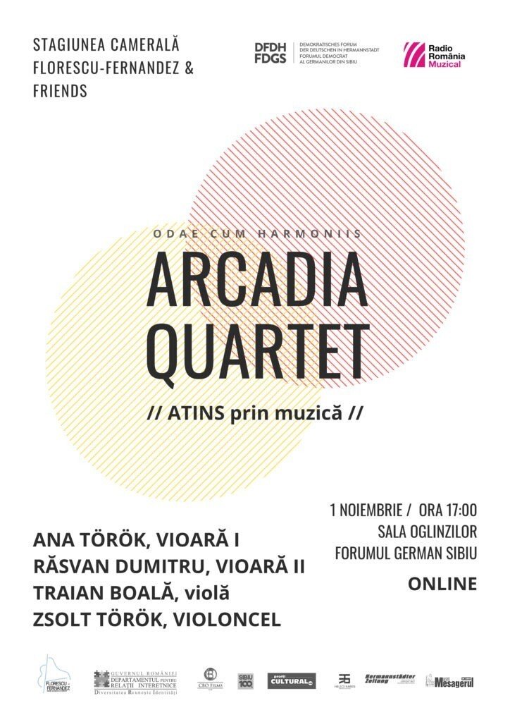 Concertul ATINS prin muzică // Arcadia Quartet //, organizat în parteneriat cu Radio România Muzical, va avea loc duminică, 1 noiembrie, de la ora 17:00, în Sala Oglinzilor a Forumului German din Sibiu și va putea fi urmărit exclusiv online pe paginile de FB Florescu-Fernandez & Friends, Radio România Muzical și pe site-ul LivestreamRomania.
