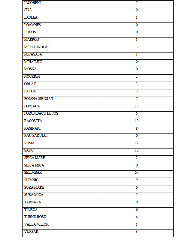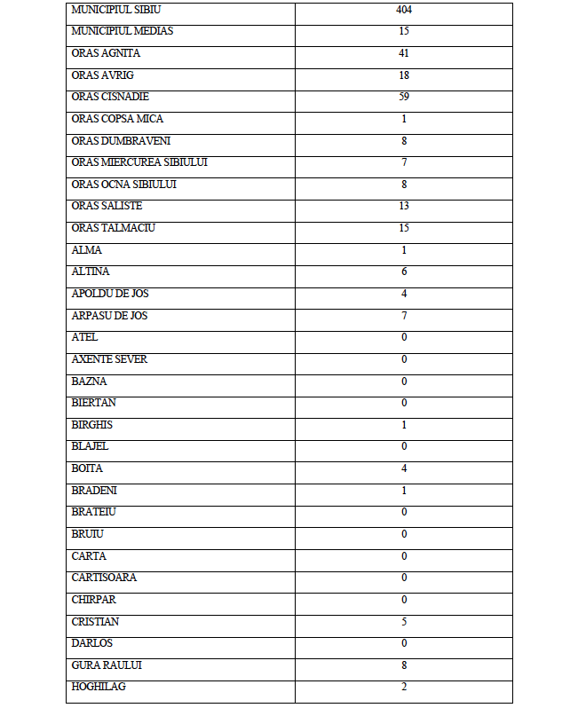La data de astăzi, 31 octombrie a.c. în județul Sibiu sunt active un număr de 801 de cazuri confirmate pozitiv în urma testării SARS CoV-2, distribuite conform tabelului de mai jos pe raza Unităților Administrativ Teritoriale ale județului Sibiu.