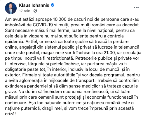 Președintele României, Klaus Iohannis a postat un mesaj pe pagina sa oficială de Facebook în care anunță măsurile luate la nivelul României pentru controlarea epidemiei de coronavirus.