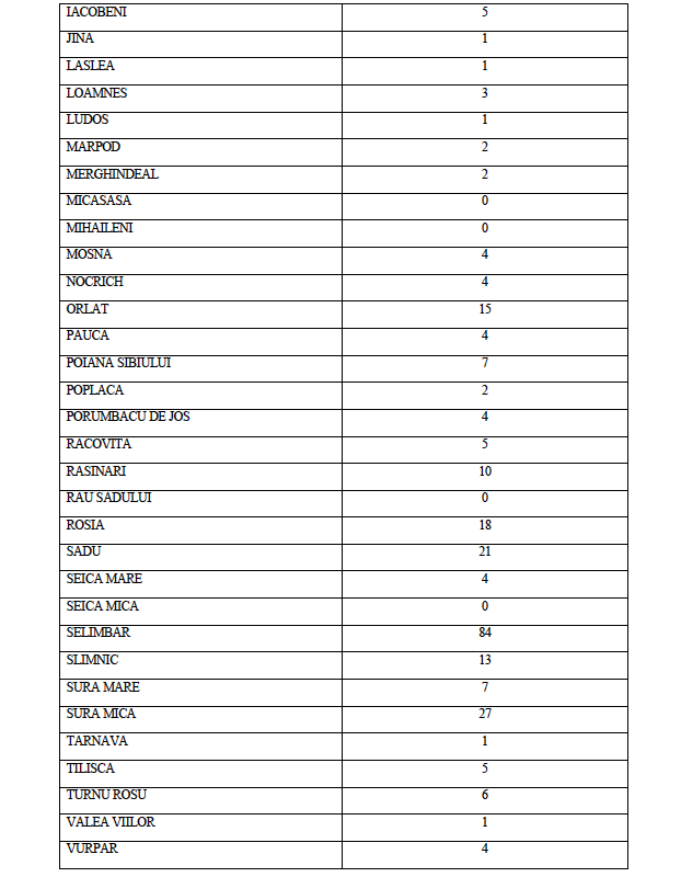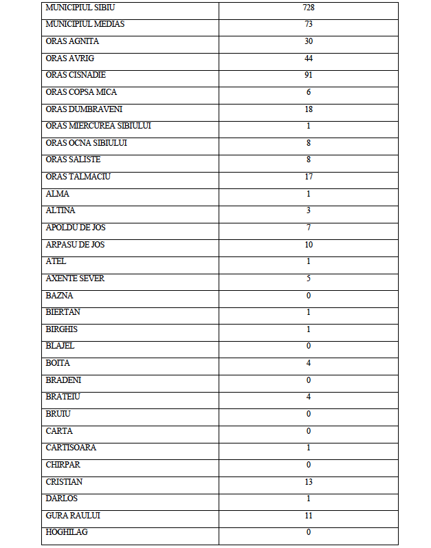 La data de astăzi, 8 noiembrie a.c. în județul Sibiu sunt active un număr de 1348 de cazuri confirmate pozitiv în urma testării SARS CoV-2, distribuite conform tabelului de mai jos pe raza Unităților Administrativ Teritoriale ale județului Sibiu