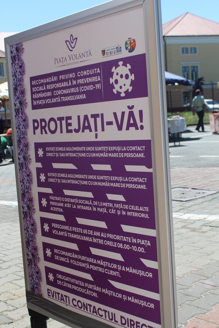 Susținerea producătorilor locali și asigurarea sănătății publice a locuitorilor sunt obiective prioritare pentru Consiliul Județean Sibiu. De aceea pentru a facilita un comerț în siguranță, am achiziționat prin Serviciul Public Sala Transilvania, dispensere care conțin dezinfectant, și care sunt amplasate la intrările și ieșirile din piață, iar în diferite locații din piață au fost montate panouri de informare pentru ca cetățenii să conștientizeze importanța respectării măsurilor de prevenire.