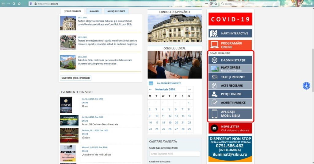 - Informații utile cetățenilor în contextul pandemiei de coronavirus pe site-ul sibiu.ro, Secțiunea COVID – 19: măsuri de protecție, restricții, informații despre rata infectării, etc.