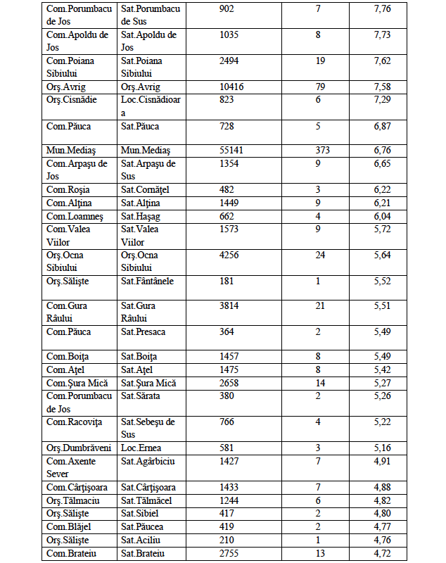 7. Oraș Tălmaciu – 62 cazuri / rata de incidență 9,02