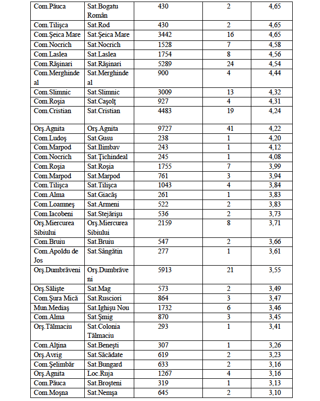 În ceea ce privește rata de incidență cumulată în localitățile din județul Sibiu este următoarea:
