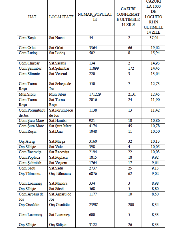 Ziarul Sibiu Independent a realizat TOP 10 localități sibiene cu cazuri noi în ultimele 14 zile.