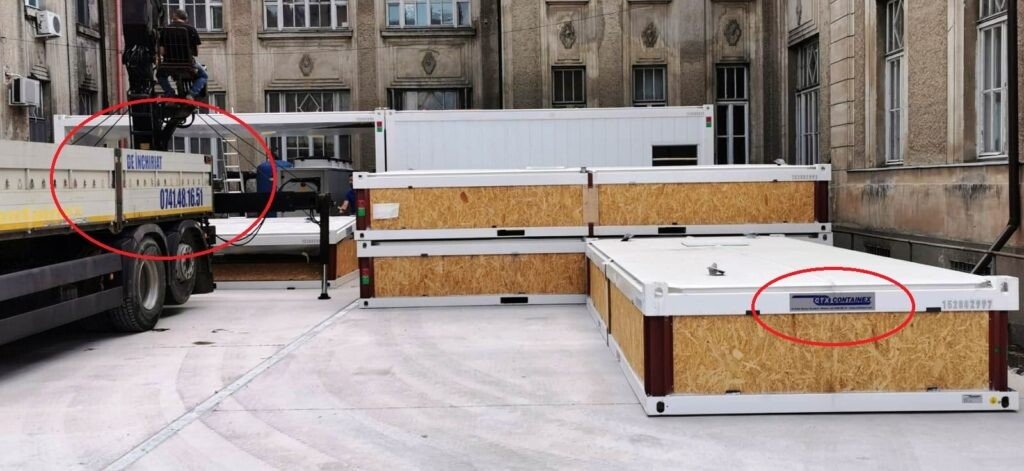 Patronul bugetar, Lucian Dârjan ne-a spus clar că firma sa, Darjan Construct Srl NU a oferit servicii de transport şi manipulare containere firmelor câştigătoare ale licitaţiei. Realitatea din teren descrisă de martorii din spital şi de fotografii spune altceva. Am cerut şi actualului management militar al Spitalului Judeţean Sibiu să ne lămurească, dar răspunsul a venit sec: să întrebăm firmele care au construit, ce subcontractori au avut. Cert este, cum reiese şi din fotografii, containerele montate au acelaşi brand cu cele din depozitul firmei Darjan Construct de la Şura Mare, Containex.