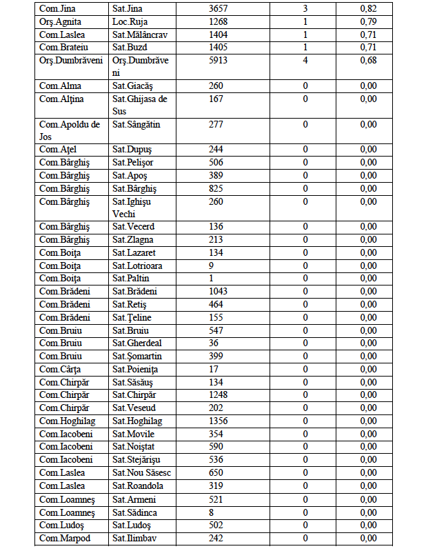 În ceea ce privește rata de incidență cumulată în localitățile din județul Sibiu este următoarea: