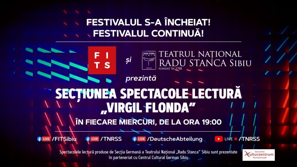 Seria evenimentelor online din cadrul ‹‹Spectacole lectură „Virgil Flonda”››, prezentate gratuit de Teatrul Național „Radu Stanca” Sibiu și Festivalul Internațional de Teatru de la Sibiu în fiecare miercuri, de la ora 19:00, pe paginile de Facebook FITS, TNRS și Secția Germană a TNRS dar și canalul de YouTube al TNRS continuă cu alte patru titluri prezentate până la finalul anului 2020: „Crima din strada Lourcine”, de Eugène Labiche, tradus în limba germană de Elfriede Jelinek, „8 giga de pornografie”, de Declan Greene, „Bolnavul închipuit“ de Molière și „Limbi adorabile”, de Neil LaBute.