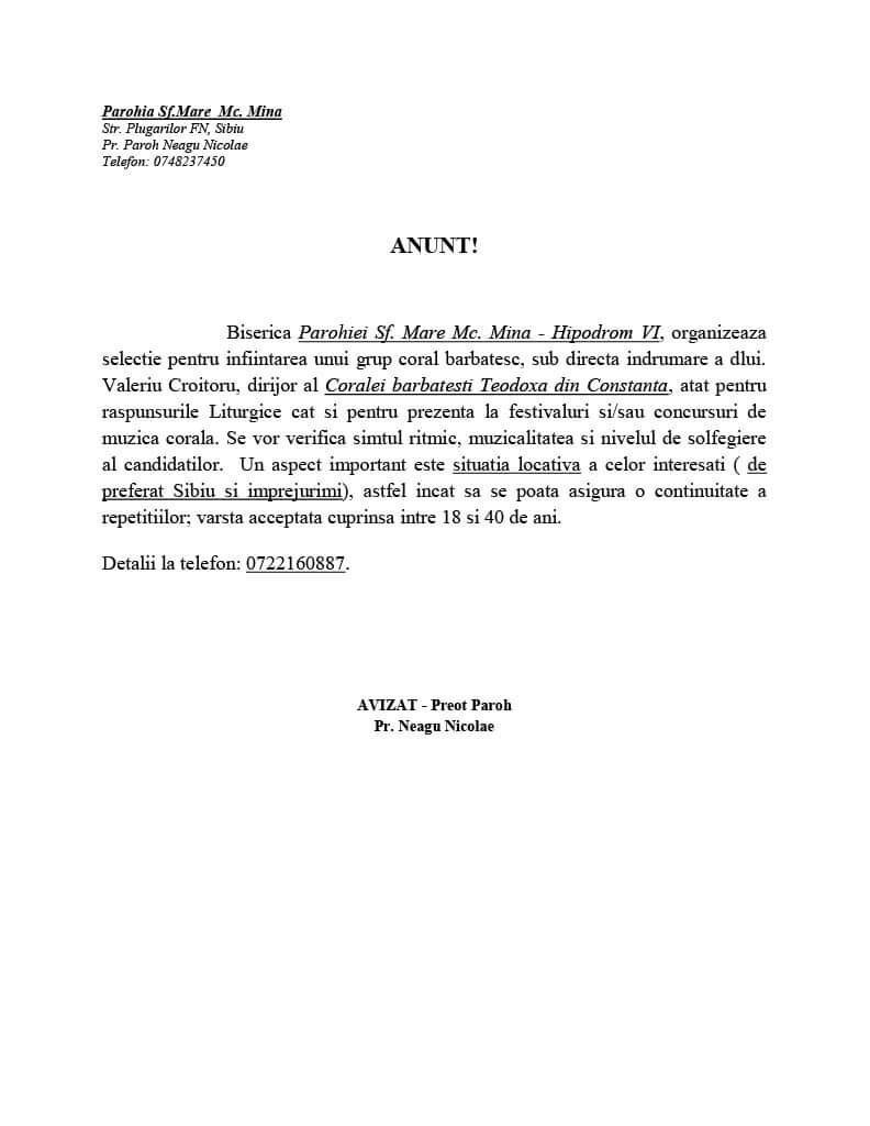 Potrivit unui anunț postat pe pagina de Facebook de reprezentanții Mitropoliei Ardealului, Biserica ”Sf. Mare Mucenic Mina” din Sibiu-Hipodrom VI organizează selecție pentru înființarea unui grup coral bărbătesc, sub directa îndrumare a domnului Valeriu Croitoru, dirijor al Coralei bărbătești „Teodoxa” din Constanta, atât pentru răspunsurile liturgice cât și pentru prezența la festivaluri și/sau concursuri de muzică corală.