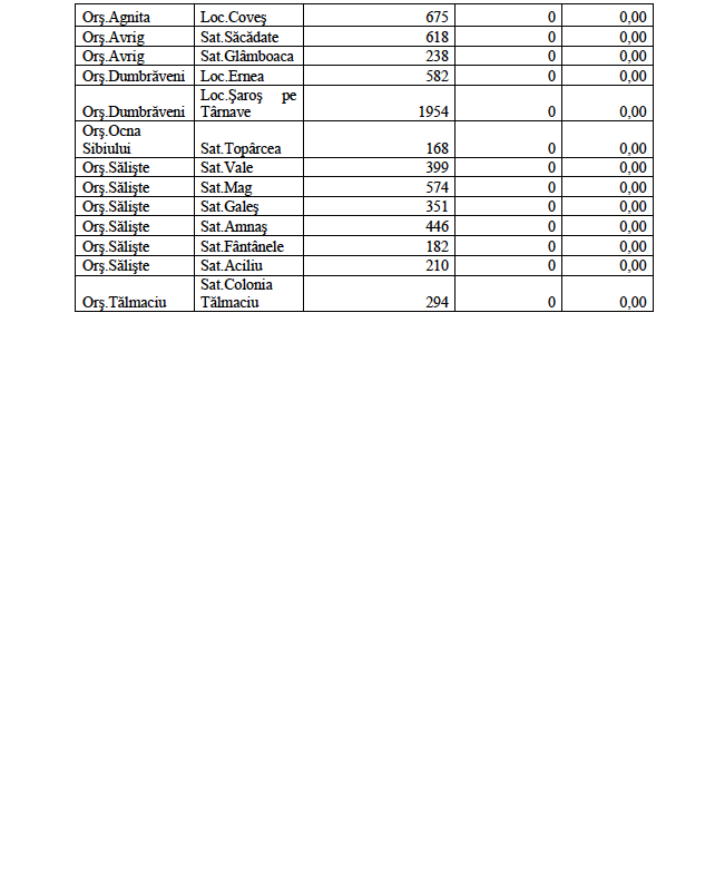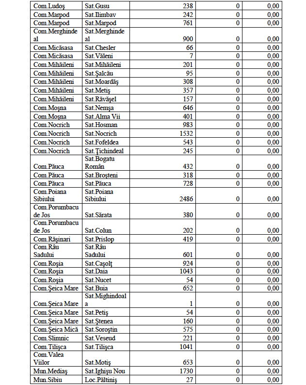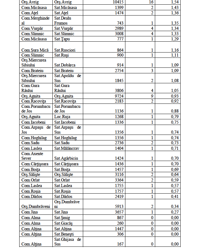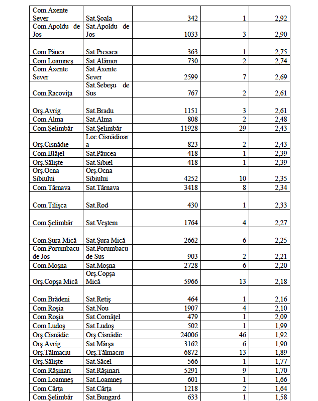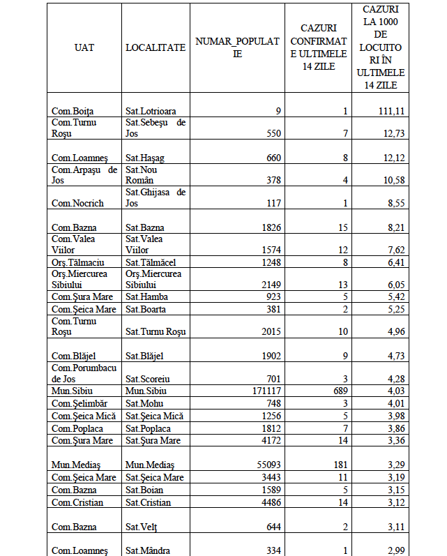 Rata de incidență cumulată la nivelul județului Sibiu este de 2,71/1000 de locuitori în ultimele 14 zile (06.12 – 19.12). În ceea ce privește rata de incidență cumulată în localitățile din județul Sibiu este următoarea:
