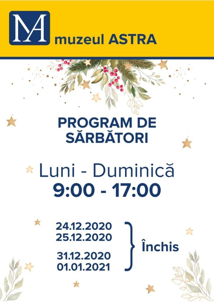 Muzeul Astra din Sibiu vă aduce la cunoștință faptul că pe 24 decembrie, dar și în prima zi de Crăciun, pe 25 decembrie, precum si în 31 decembrie și în 1 ianuarie, complexul va fi închis.
