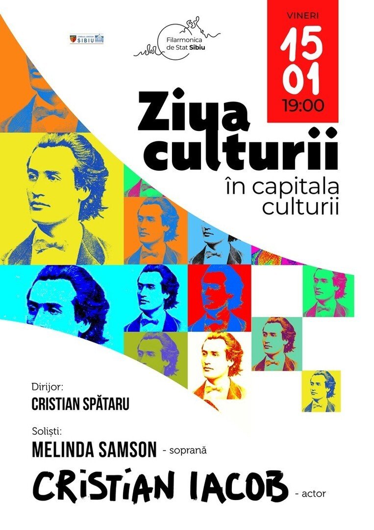 Filarmonica de Stat Sibiu vă invită la sărbătoarea culturii oferindu-vă un spectacol eveniment, vineri 15 ianuarie ora 19.00 la Sala Thalia. Celebrul actor Cristian Iacob ne va face să zâmbim povestindu-ne preferatele Isprăvi ale lui Păcală și apoi întruchipând toate personajele basmului “Tinerețe fără bătrânețe si viață fără de moarte”. Pe Eminescu îl vom auzi cântat de invitata noastră de suflet, Melinda Samson, care va valsa pe muzica lui Vasile Timiș.