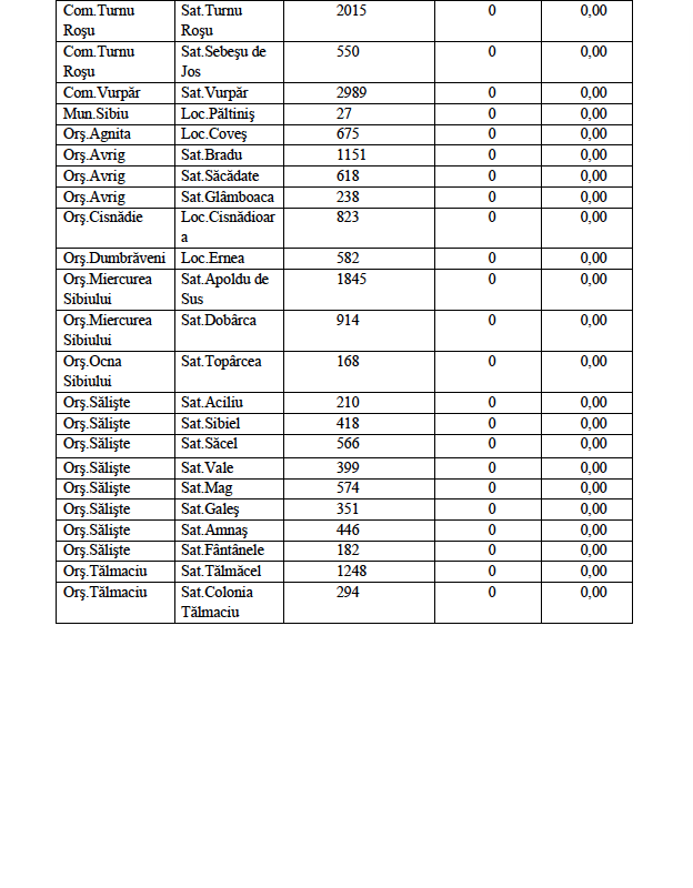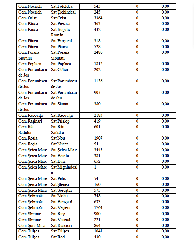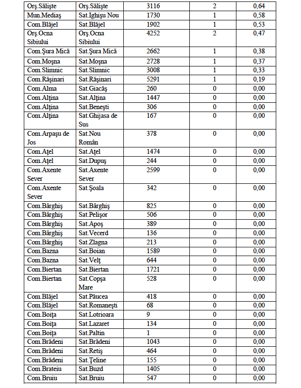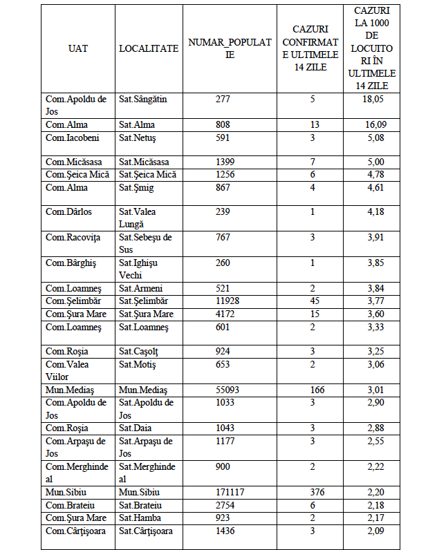 Rata de incidență cumulată la nivelul județului Sibiu este de 1,66/1000 de locuitori în ultimele 14 zile (03.01 – 16.01). În ceea ce privește rata de incidență cumulată în localitățile din județul Sibiu este următoarea: