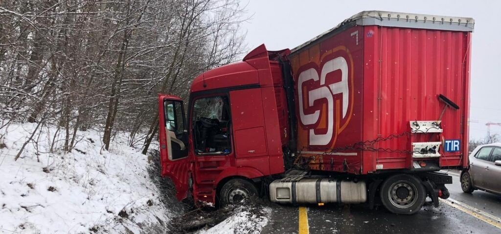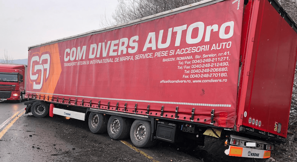 Din primele informații se pare că șoferul autocamionului nu a adaptat viteza la condițiile de drum și a ieșit de pe partea carosabilă, blocând cu remorca o bandă de circulație. Din fericire, nimeni nu a fost rănit.
